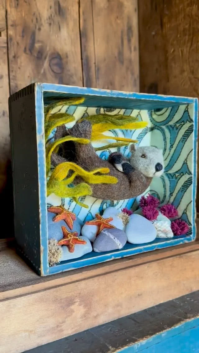 This needle felted humpback whale is 17 inches long and the drift wood on which it is mounted measures 20 inches long. The whale is 100% wool throughout and built over a wire armature. The tubercles are iridescent beads hand sewn to the head. There is also a felted barnacle colony at the anterior of the ventral grooves. The wool topcoat is a color blend of blue and black with iridescent fiber to add shimmer, giving it the effect of dappled underwater light. The driftwood is from a local Eastham beach and the scientific name is wood-burned into it. The dowels are lucite. The underside of the driftwood is signed and dated by the artist. This large wool sculpture looks great on a bookshelf or mantle